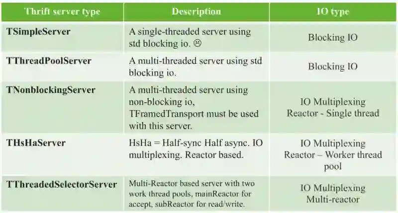 说个具体的例子,Thrift 作为一个融合了 序列化 +RPC 的框架,提供了很多种 Server 的构建选项,从名称中就可以看出他们使用哪种 I/O 和线程模型。