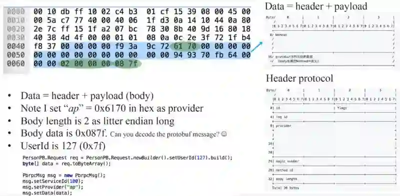 协议结构,英文叫做 wire protocol 或者 wire format。TCP 只是 binary stream 通道,是 binary 数据的可靠搬用工,它不懂 RPC 里面包装的是什么。而在一个通道上传输 message,势必涉及 message 的识别。