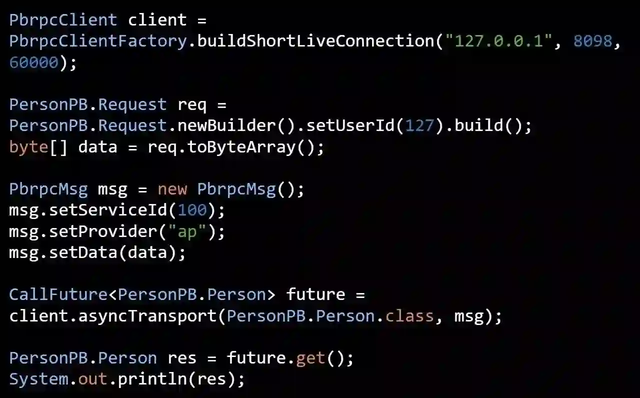 client 端代码实现如下。首先构造 PbrpcClient,然后构造 PersonPB.Request,也就是请求,设置好 user_id,构造 PbrpcMsg 作为 TCP 层传输的数据 payload,这就是协议结构中的 body 部分。