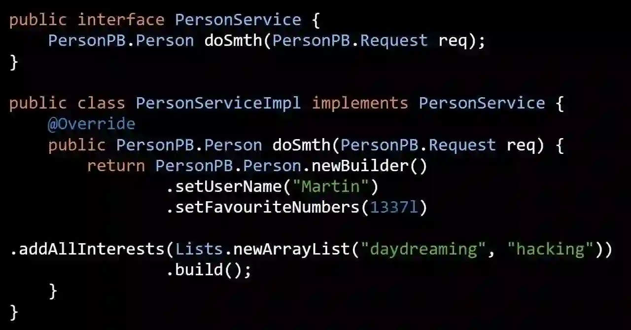 server 端需要开发请求响应接口,API 是 PersonPB.Person doSmth(PersonPB.Request req),实现如下,包含一个 Interface 和一个实现 class。