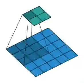 这一点可能会让人觉得有点难以理解,所以我们来看一个具体的例子,如上图。5x5的图像被送入一个卷积层进行卷及计算。步长设置为2,没有填充,卷积核为3x3。输出为一个2x2图像。