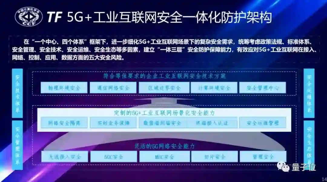 中国移动安全中心张峰的演讲主题是《5G+工业互联网安全风险及应对》,他首先给大家介绍了5G+互联网的概念,介绍了512工程:5个公共服务平台,10个重点行业,20个重点应用场景。同时讲述了5G的一系列特点,如高带宽、低延时、空口加密传输等,描述了5G在工业互联网的各种应用场景,并通过具体案例讲述了5G工业互联网应用所面临的安全风险,提出一个中心,四个体系的安全总体防护思路,四个体系是安全的技术体系,安全的管理体系,安全的运维体系,安全的生态体系,一个中心就是安全管理中心。