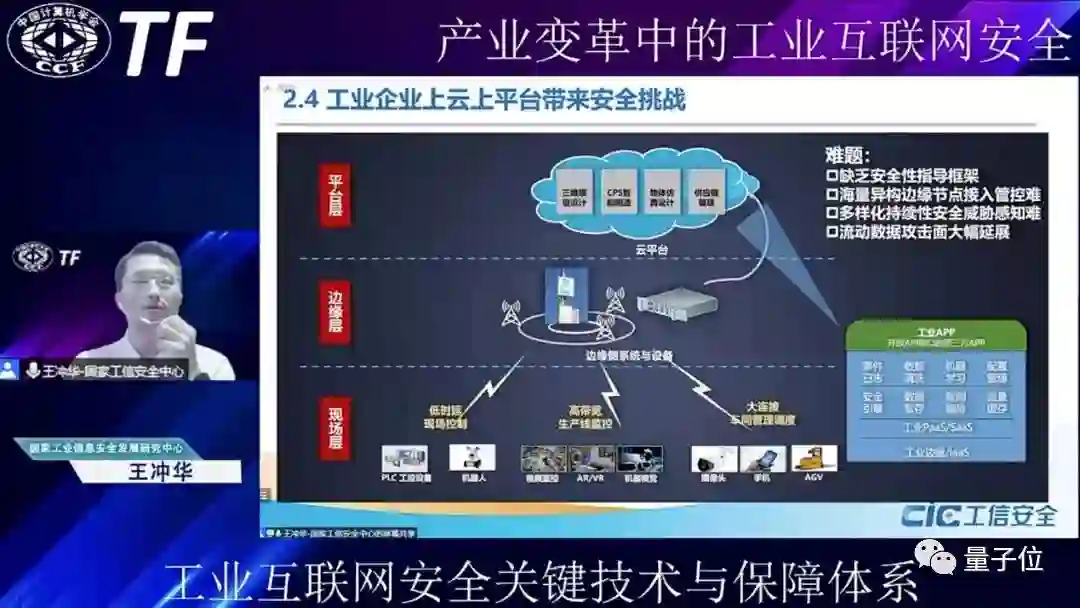 王冲华首先做了题为《工业互联网安全关键技术与保障体系》的报告,为大家介绍了工业互联网安全总体概况,从涉及工业互联网的三种企业类型:使用工业互联网的工业企业、工业互联网平台企业工业互联网的标识解析系统的建设运营机构。