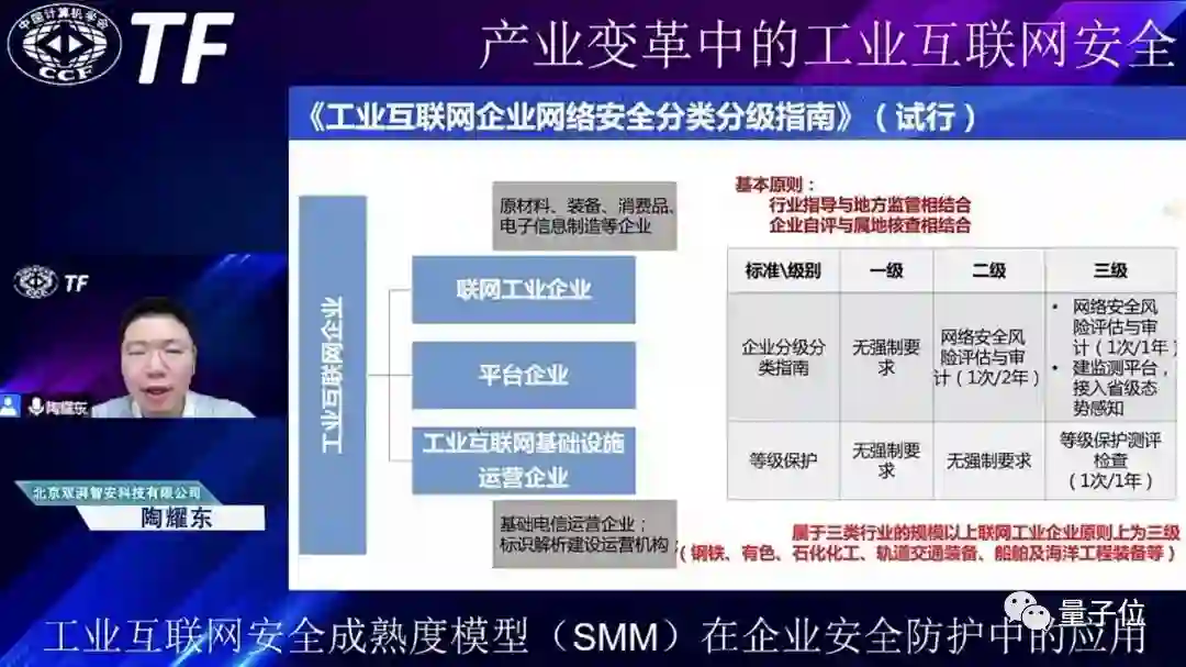 陶耀东的报告题目是《工业互联网安全成熟度模型与应用实践》,他首先分享了工业互联网给企业带来的好处,介绍了工业互联网联盟的迅速发展,提到工业互联网分类分级的必要性,然后具体介绍了工业互联网安全成熟度模型,三大域、九大子域、十八个时间域。