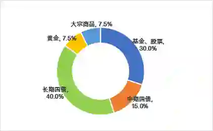 30%的资产配置在股票上(包含基金在内)、15%中期国债(7-10年)、40%配置到长期国债(20-25年),最后再配置7.5%的黄金和7.5%的大宗商品。