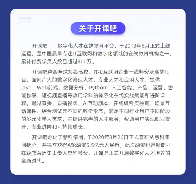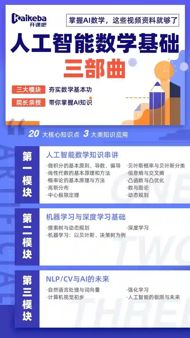 扫码下方的二维码,报名参加我们的课程。在享受超强课程优惠的同时,你还将获得由开课吧精心为你准备的AI学习资料《人工智能数学基础三部曲》。