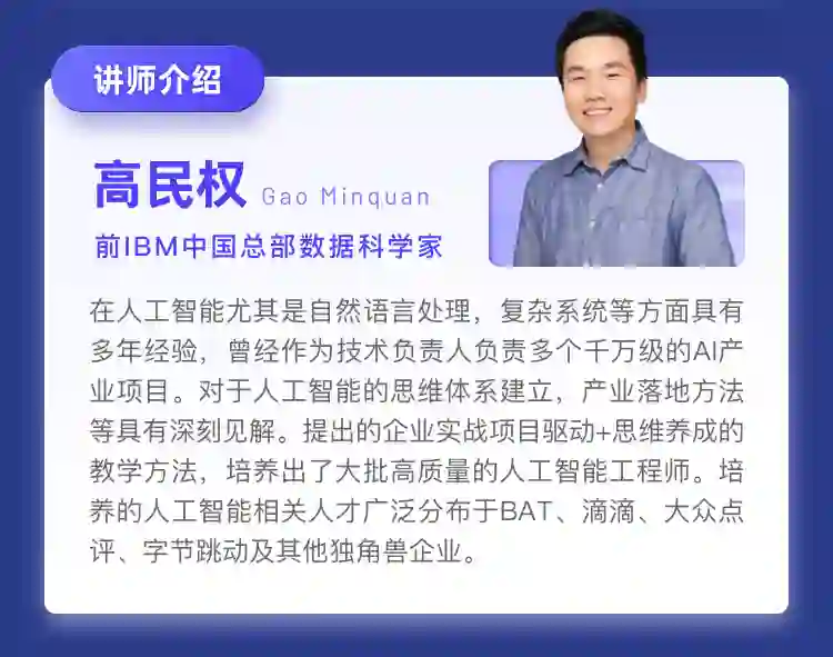 高民权老师,在人工智能尤其是自然语言处理,复杂系统等方面具有多年经验,曾经作为技术负责人负责多个千万级的AI产业项目。