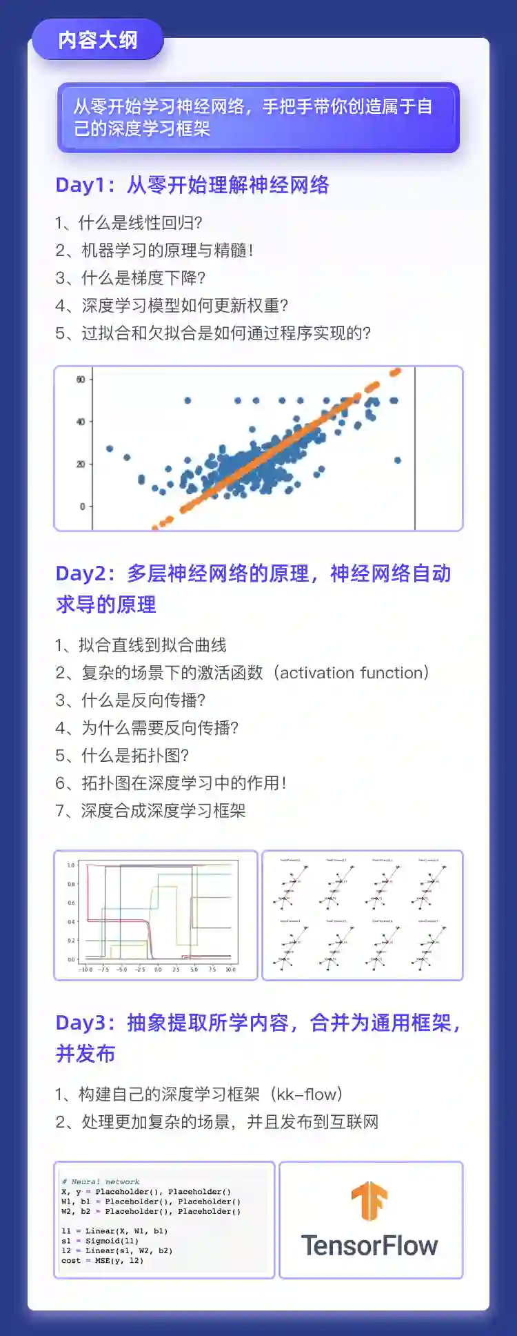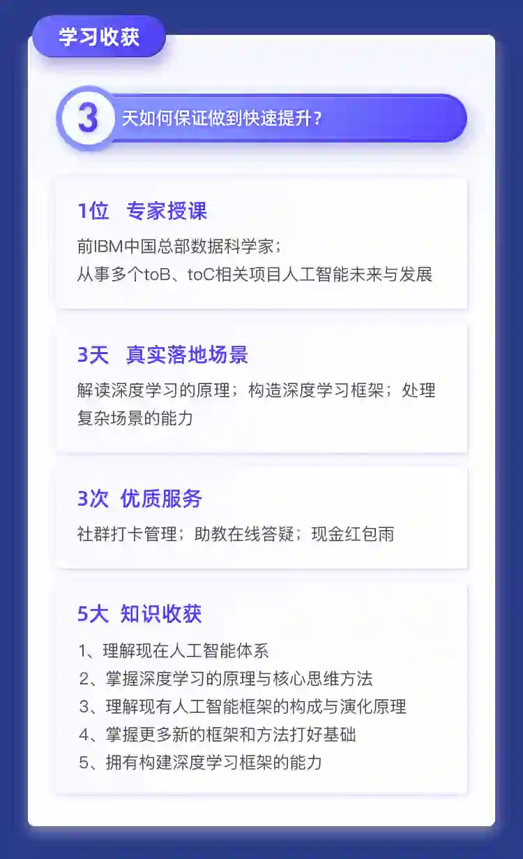 通过3天的《用纯Python从零创造自己的深度学习框架》,了解人工智能体系及整体框架结构,用最短的时间一次性掌握深度学习的原理与核心思维方法,深入理解人工智能框架的构成与演化原理。