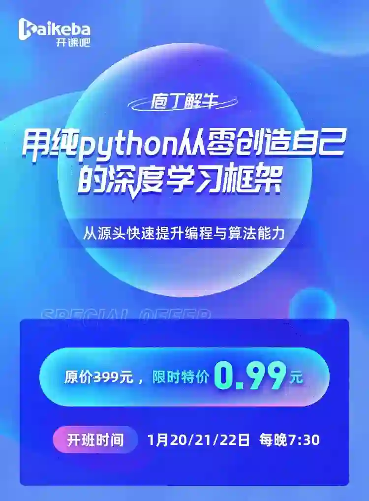 所以,1月20、21、22日,为期3天的训练营《用纯Python从零创造自己的深度学习框架》,即将拯救迷茫的你。