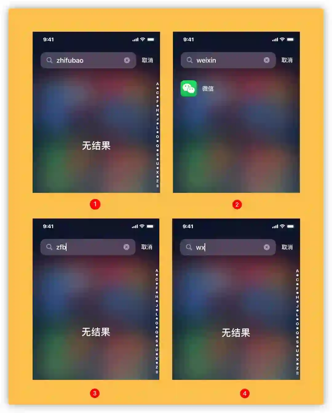在之前的测试版中,该问题曾经被修复,但正式版依旧出现了该问题,表现为模糊搜索不够准确,例如输入「zfb」「zhifubao」「wx」的拼音均无法搜索到「支付宝」或「微信」,但输入「weixin」却可以搜索到「微信」,拼音模糊搜索的逻辑有些混乱。
