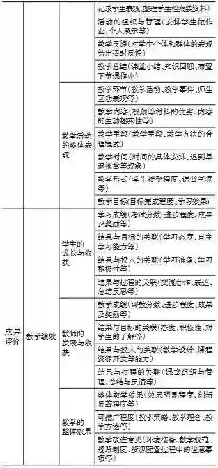 (5)对于成果评价,专家们一致认同以“教学绩效”作为一级指标,并用“学生发展”“教师发展”“教学整体效果”三个二级指标来反映目标达成、存在问题和促进成长的目的。依据成果评价的内容以及“绩”和“效”相结合的原则,70%的专家认为可以从“教学结果”“结果与教学目标的关联性”“结果与教学投入的关联性”“结果与教学过程的关联性”“教学效果的价值与意义”“可推广程度”“教学改革意见”等方面来设定第三级指标。