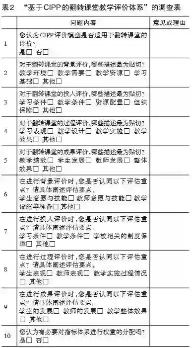 (1)所有专家一致认为CIPP模型适合评价翻转课堂。理由是:使用CIPP模型能够对翻转课堂进行过程评价,强调改进与反馈,为当前翻转课堂的评价提供了很好的思路与方法。