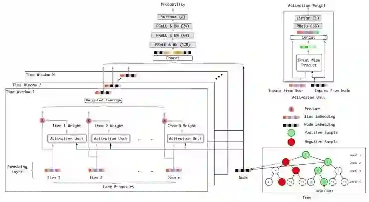受到之前在点击通过率 CTR 模型方面研究的启发,作者们设计的深度神经网络模型(上图)可以从树中学到低维的嵌入,然后结合注意力模块寻找相关的用户行为,以便更好地表征用户。网络的输入也可以接收多个块,每个块中包含用户在不同时间窗口内的行为。借助注意力模块和后部的多层神经网络,这个模型的表现和容量得以大幅提高,同时也不再受到前文提到过的表示为向量和向量内积的限制。