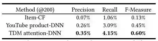 参与对比的基准模型包括 FM 矩阵分解、BPR-MF 隐式反馈推荐矩阵分解、 ItemCF 基于物品的协同过滤算法、YouTube product-DNN。TDM 的变种则包括去掉注意力模块、使用和 YouTube product-DNN 同样的内积方法的 TDM product-DNN,仅去掉激活模块的 TDM DNN,以及使用 hierarchical softmax 树的 TDM attention-DNN-HS。