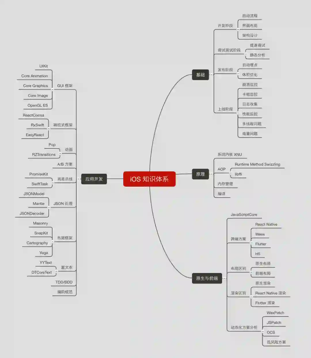 我热爱分享,喜欢将平时学习和工作中的经验分享到我的博客和微博上,也会将一些技术总结通过代码发到 GitHub 上。为了帮助让大家可以更加清晰构建 iOS 完整的知识脉络,我特地整理了一张脑图,希望可以帮到你。
