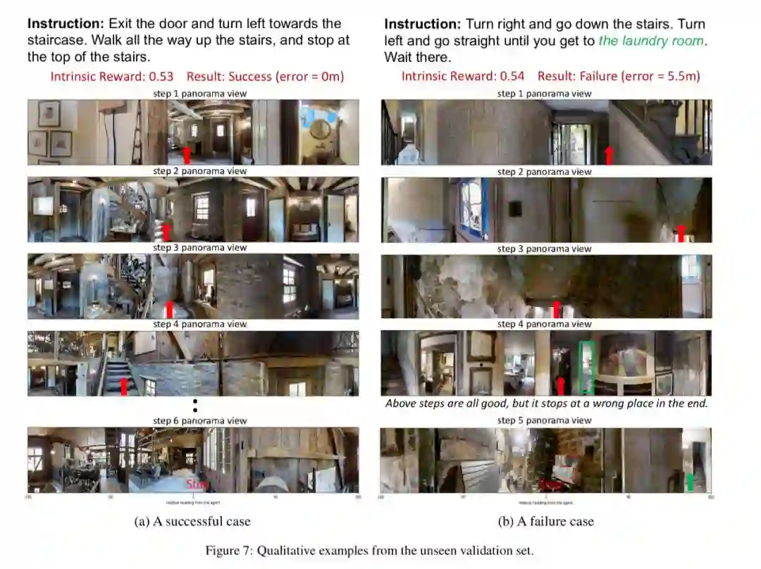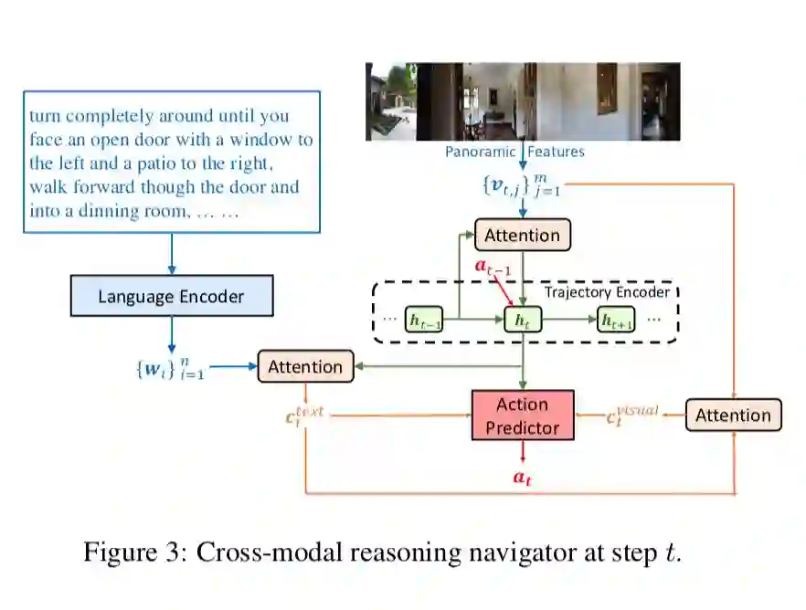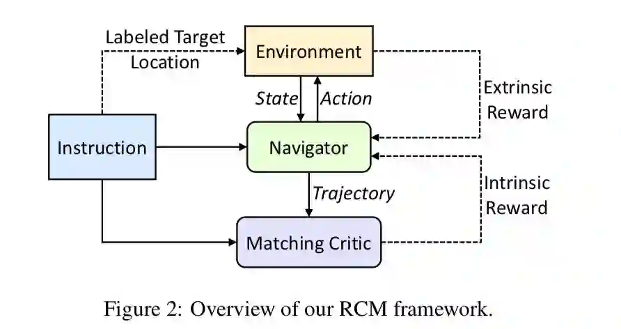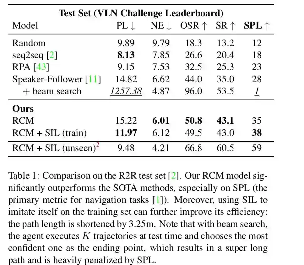 RCM 模型主要由两个模块构成:推理导航器和匹配度评估器。如图所示,通过训练其中绿色的导航器,让它学会理解局部的跨模态场景,推断潜在的指令,并生成一系列动作序列。另外,论文还设置了匹配度评估器(Matching Critic)和循环重建奖励机制,用于评价原始指令与导航器生成的轨迹之间的对齐情况,帮助智能体理解语言输入,并且惩罚不符合语言指令的轨迹。