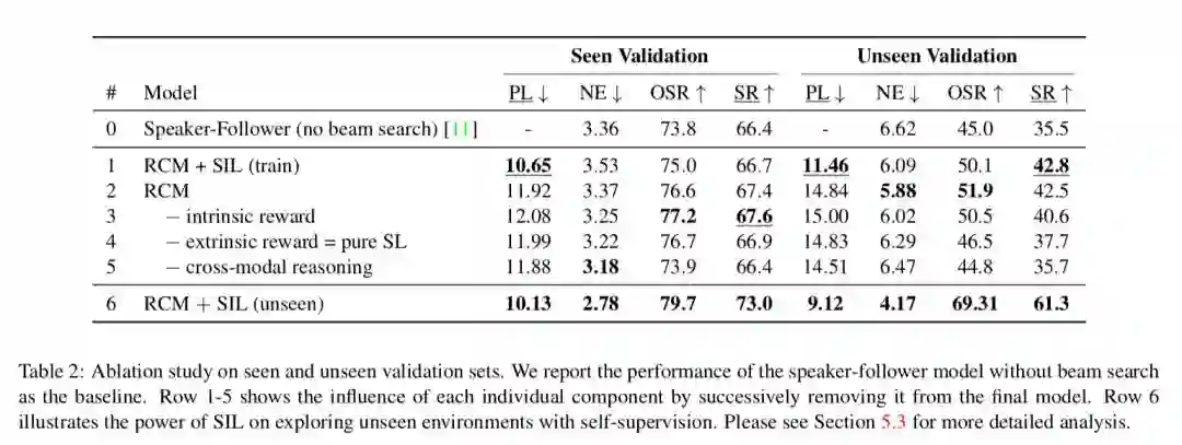 为了解决第三个难点,论文提出了一种自监督模仿学习(Self-supervised Imitation Learning, SIL),其目的是让智能体能够自主的探索未知的环境。其具体做法是,对于一个从未见过的语言指令和目标位置,导航器会得到一组可能的轨迹并将其中最优的轨迹(采用匹配度评估器)保存到缓冲区中,然后匹配度评估器会使用之前介绍的循环重建奖励机制来评估轨迹,SIL方法可以与多种学习方法想结合,通过模仿自己之前的最佳表现来得到更优的策略。