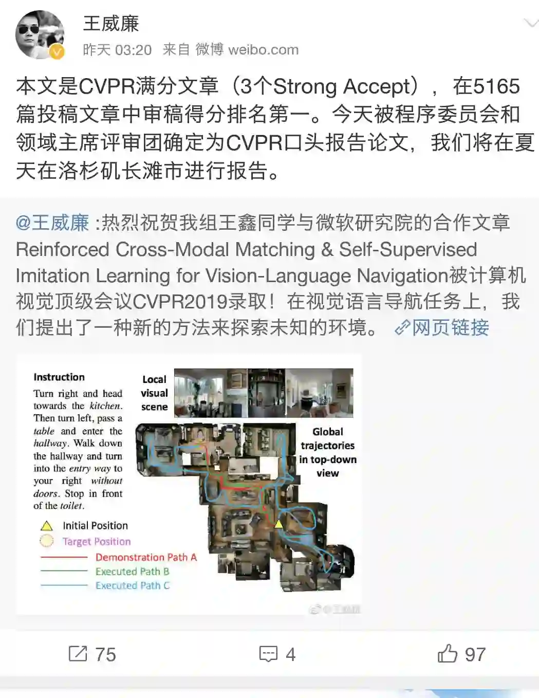 据 UC Santa Barbara 计算机科学系助理教授王威廉在其个人微博上发表的喜讯,这篇论文的一作是其组内的成员,获得了 3 个 Strong Accept,在 5165 篇投稿文章中审稿得分排名第一,并且这篇论文已经确定将在 6 月的 CVPR 会议上进行报告。