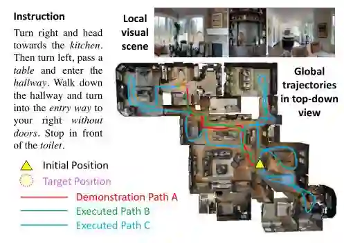 视觉语言导航(vision-language navigation, VLN)任务指的是引导智能体或机器人在真实三维场景中能理解自然语言命令并准确执行。结合下面这张图再形象、通俗一点解释:假如智能体接收到“向右转,径直走向厨房,然后左转,经过一张桌子后进入走廊...”等一系列语言命令,它需要分析指令中的物体和动作指令,在只能看到一部分场景内容的情况下,脑补整个全局图,并正确执行命令。所以这是一个结合 NLP 和 CV 两大领域,一项非常有挑战性的任务。