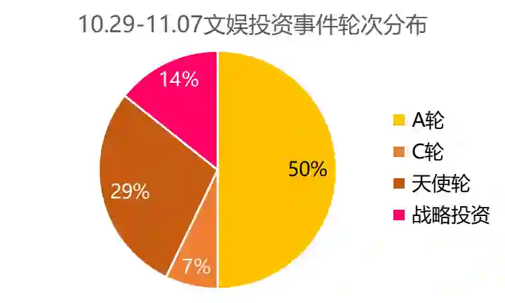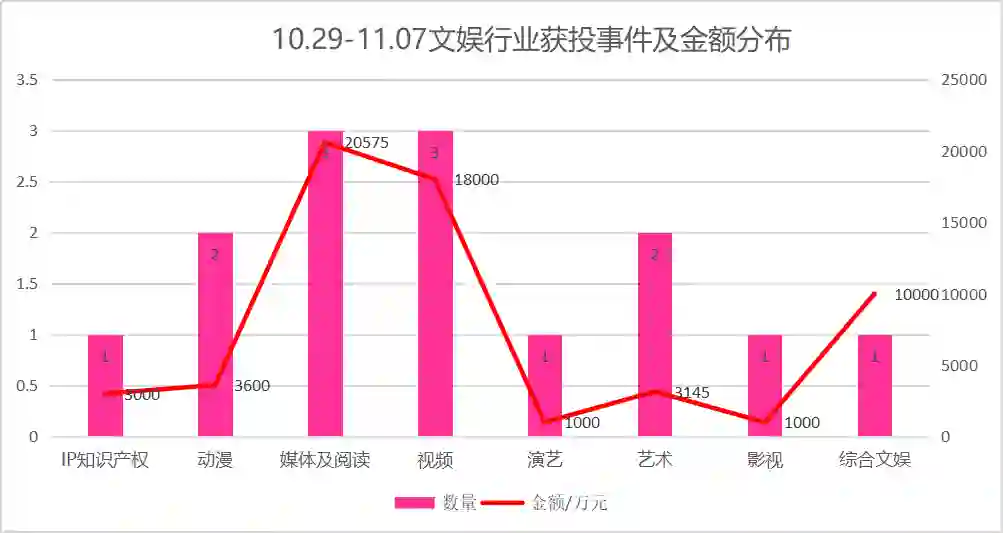 10 月 29 日至 11 月 7 日,文娱领域共计发生 14 起投资事件,涉及动漫、视频、演艺等 8 个子行业,投资资金约合 6 亿元。