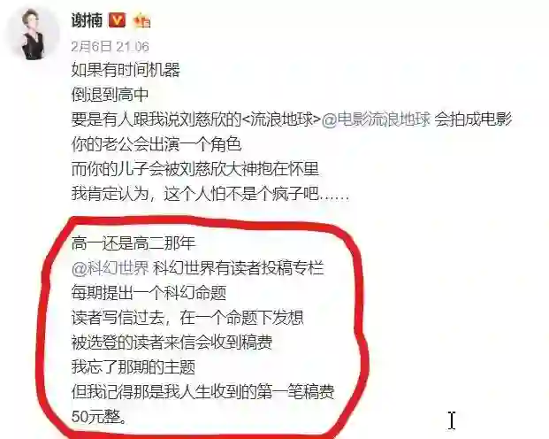 《流浪地球》上映后她发了一条微博,可见她从小就是大刘的粉丝。