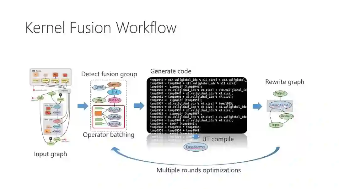 解决这一问题的主要思路是内核融合(Kernel Fusion)。一些手工的优化方法就运用了这一思想,比如NVIDIA基于CuDNN的RNN库函数。它把整个循环神经网络实现成一个GPU的内核函数,因此获得了非常好的性能。然而它的缺点也非常明显,那就是不够灵活和通用,无法应用在其它网络或一些变种的循环神经网络中。而我们更加关注的是如何在深度学习的系统中自动地对任意的网络模型实施优化。