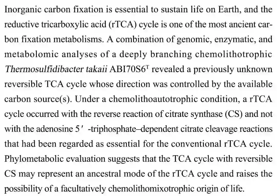(导读 郭思瑶)还原三羧酸(rTCA)循环是地球上最古老的碳固定代谢方式。科学家通过对化能无机营养细菌 Thermosulfidibacter takaii ABI70S6T 进行基因分析,酶分析以及代谢分析,发现 rTCA 循环的方向被可供使用的碳源调控。在化能自养的条件下,rTCA 循环伴随着柠檬酸盐合成的逆反应,这可能代表着一种古老的 rTCA 循环模式,可能揭示了兼性化能自养生命的起源。