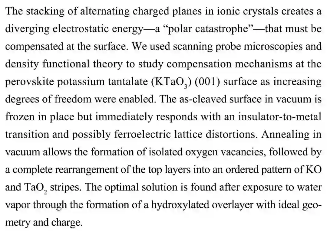 (导读 卓思琪)离子晶体中交替带电的平面堆叠会产生发散的静电能(极性激变),带来不稳定性,因此它必须通过表面重构得到补偿。本文研究了钙钛矿钽酸钾 KTaO3 (001) 表面的补偿机制。切割的表面被冷冻并固定在真空中,升温后能立即做出从绝缘体转变为金属的响应,并且可能产生铁电晶格变形。真空中退火会形成氧空缺,而后表面顶层重排形成有序的 KO 和 TaO2 条纹。最优方案是将表面暴露于水蒸气中,形成具有理想几何形状和电荷的羟基化覆盖层。