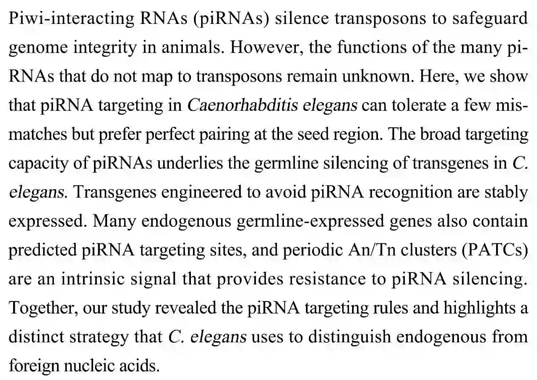 (导读 郭怿暄)piRNA 沉默转座子从而保护动物基因组稳定性,但非转座子定位的 piRNA 功能尚不清楚。本研究发现线虫中 piRNA 靶向规则:种子序列倾向完全匹配,其它区域允许少量不匹配。利用这一规则设计出避免 piRNA 识别且稳定表达的转基因。许多內源生殖系表达基因同样具有 piRNA 靶向位点,但其內源周期性 An/Tn 簇(PATCs)信号可对 piRNA 沉默产生抵抗,从而区分内源外源核苷酸序列。