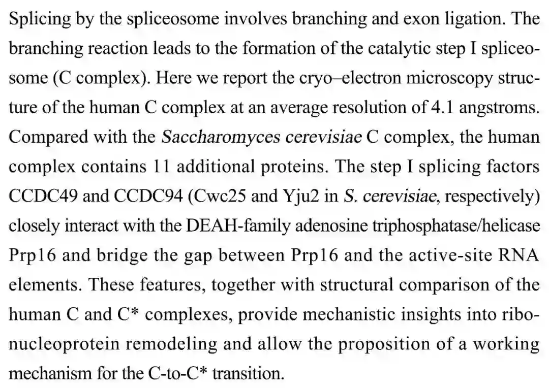 (导读 郭怿暄)剪切体对 mRNA 的剪切涉及分支和外显子连接两个步骤,分支反应中催化第一步剪切体(C 复合体)形成。本研究解析了人类 C 复合体的冷冻电镜结构,它与酵母 C 复合体相比包含额外 11 个蛋白质。第一步剪切因子 CCDC49 和 CCDC94 与解旋酶 Prp16 的相互作用可帮助 Prp16 与 RNA 元件接触。这一结构为了解核糖核蛋白重塑及人类 C 复合体向 C* 复合体转换机制奠定基础。