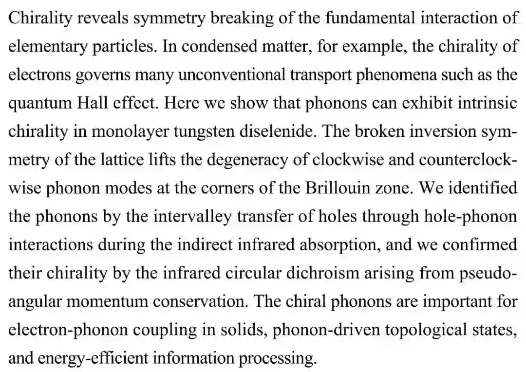 (导读 阿金)手性揭示基本粒子相互作用的对称破缺。本研究展示了单层二硒化钨中的声子存在内在手性,在间接红外吸收过程中通过空穴-声子相互作用的空穴谷间传输确定声子,通过赝角动量守恒产生的红外圆二色谱确认它们的手性。研究结果对处理固体中电子声子耦合、高能效信息处理等非常重要。
