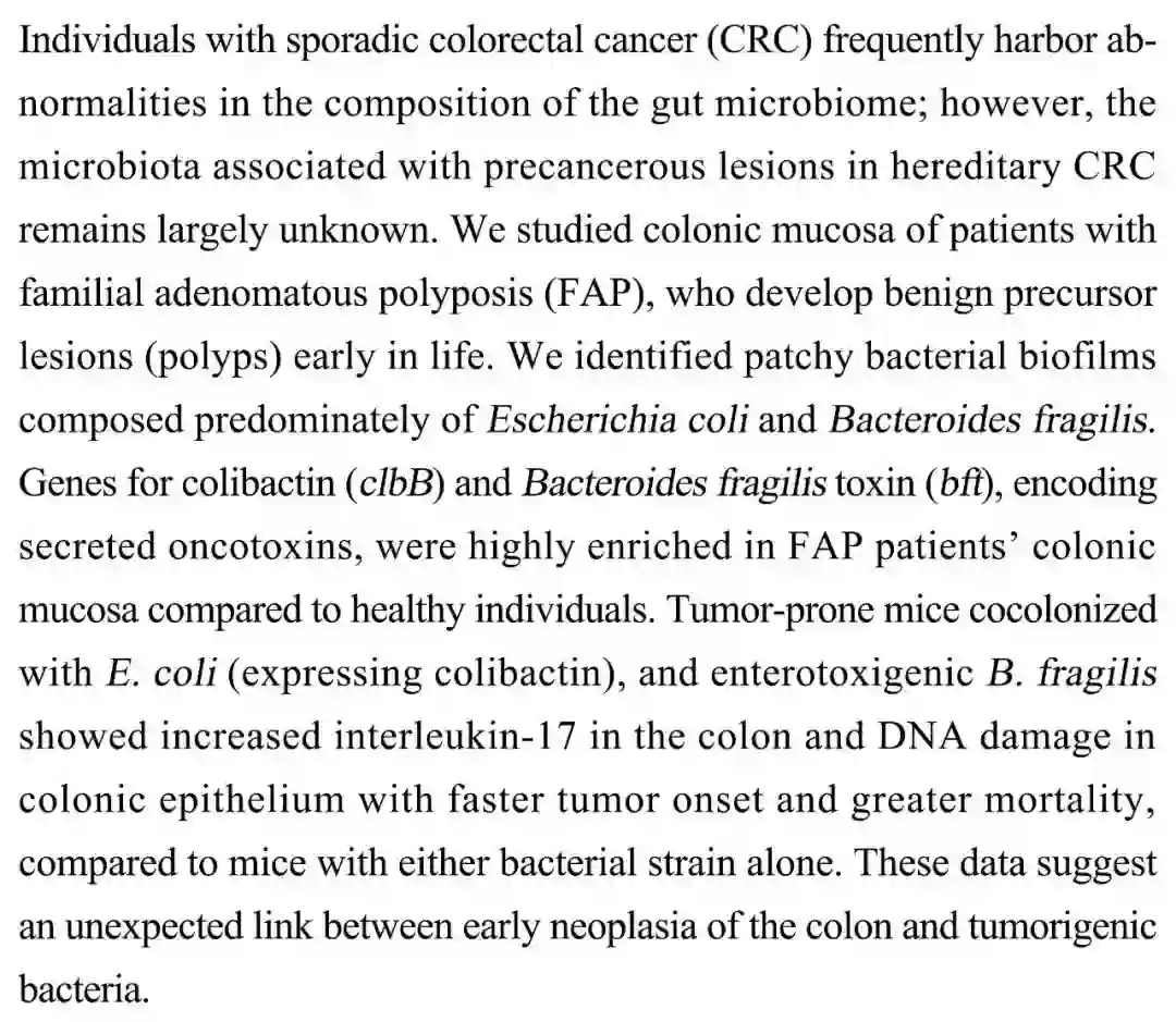 (导读 卓思琪)肠道菌群对遗传性结直肠癌(CRC)前病变的影响仍未知晓。本文发现家族性腺瘤性息肉病(FAP)病人的结肠黏膜有些区域主要由大肠杆菌和脆弱拟杆菌组成,且富集了致癌毒素 colibactin (clbB) 和脆弱拟杆菌毒素(bft)。移植能产生 clbB 的大肠杆菌和脆弱拟杆菌会提高小鼠的肿瘤发病率和死亡率。该数据暗示结肠早期肿瘤与致癌菌之间存在着意想不到的联系。