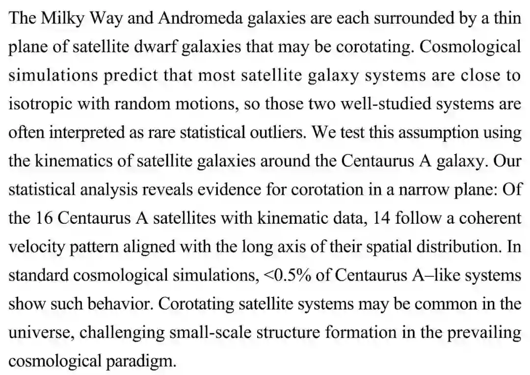 (导读 雷鸣)银河系等庞大星系周围都环绕着矮星系。标准宇宙模型预测,这些矮星系应该是环绕宿主星系随机运动。本研究通过半人马 A 周围卫星系运动学数据来检验上述假设。统计分析显示,半人马 A 周围的卫星系在一个窄平面内共旋,这一结论与前述假设相悖。这种情况有可能是一种常态,而传统宇宙论或许存在某些错误。