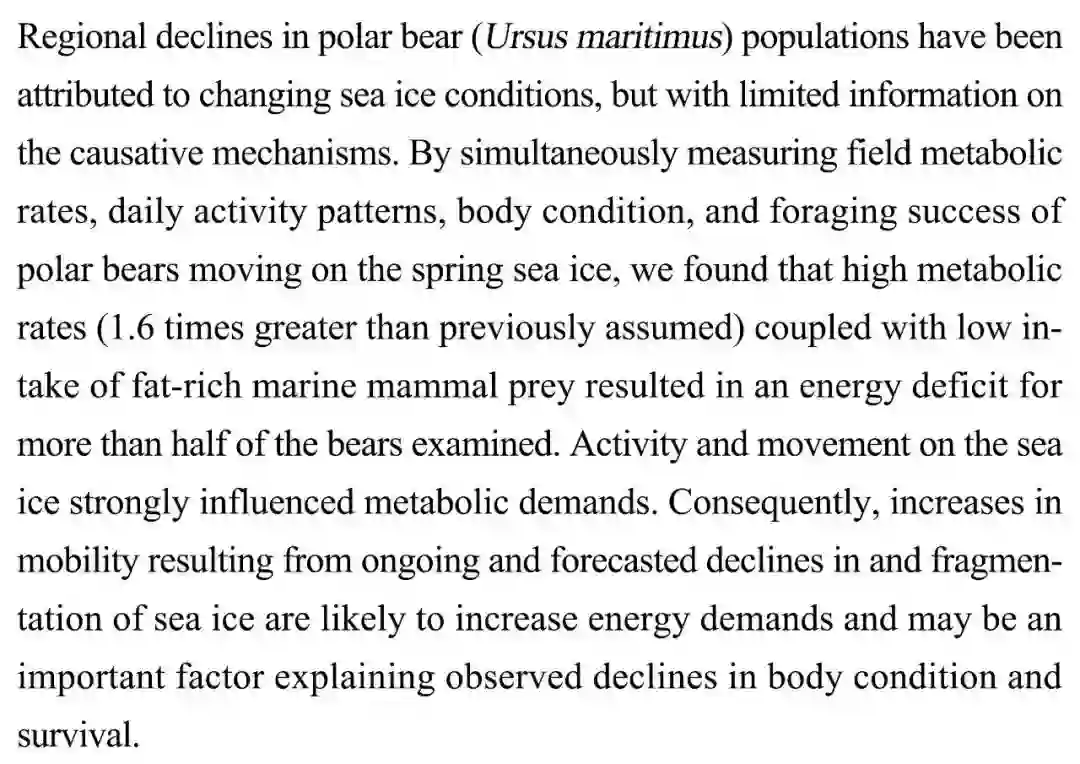 (导读 刘晓娟)海冰变化导致北极熊数量减少,但对其影响机制研究仍有限。本文同时观测了北极熊代谢率、日活动模式、身体状态和春季海冰觅食成功率,发现高代谢率和对高脂肪的低摄入导致了几乎一半数量的北极熊遭遇能量赤字,行为活动和海冰觅食严重影响着代谢需求。因此,海冰持续破碎和减少可能会增加北极熊的能量需求,而这也可能是北极熊身体状态变差和存活率低下的重要原因。