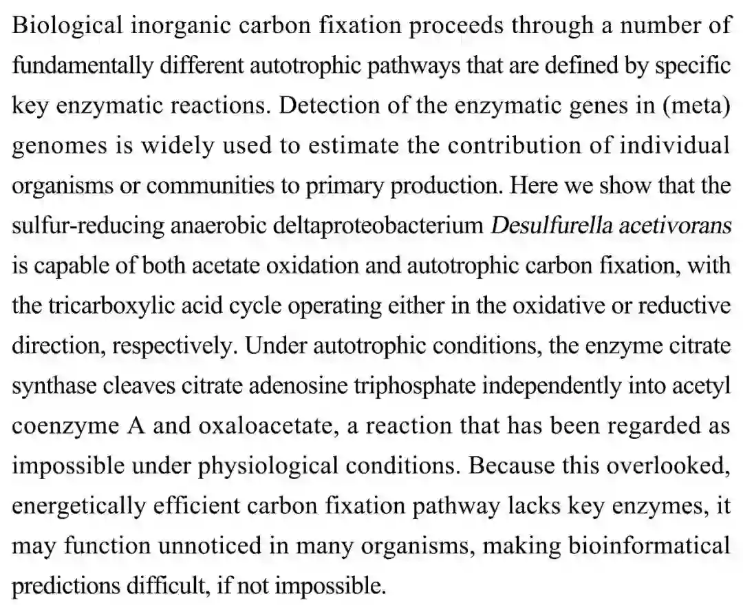(导读 郭思瑶)生物无机碳固定通过多个关键酶反应完成。 科学家发现降硫厌氧变形菌 Desulfurella acetivorans 能够从氧化或还原两个方向进行自养碳固定。自养条件下,柠檬酸合酶将柠檬酸腺苷三磷酸分解为乙酰辅酶 A 和草酰乙酸盐,这个反应长期被认为在生理条件是无法发生的。该研究揭示了一条长期被忽略的碳固定通路。