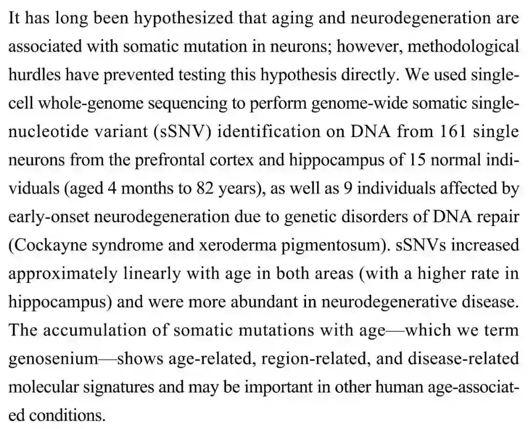 (导读 柳寒石)本文利用全细胞基因组测序技术分别鉴定了来自正常和早发型神经退行性疾病个体的 161 个前额叶皮层和海马的单个神经元中的单核苷酸变异(sSNV),发现在这两个区域中 sSNVs 几乎随着年龄增加而呈现线性增加,并且在神经退行性疾病中有更高的丰度。这表明随着年龄增加的体细胞突变积累可以作为指示人类年龄相关疾病的分子标记。