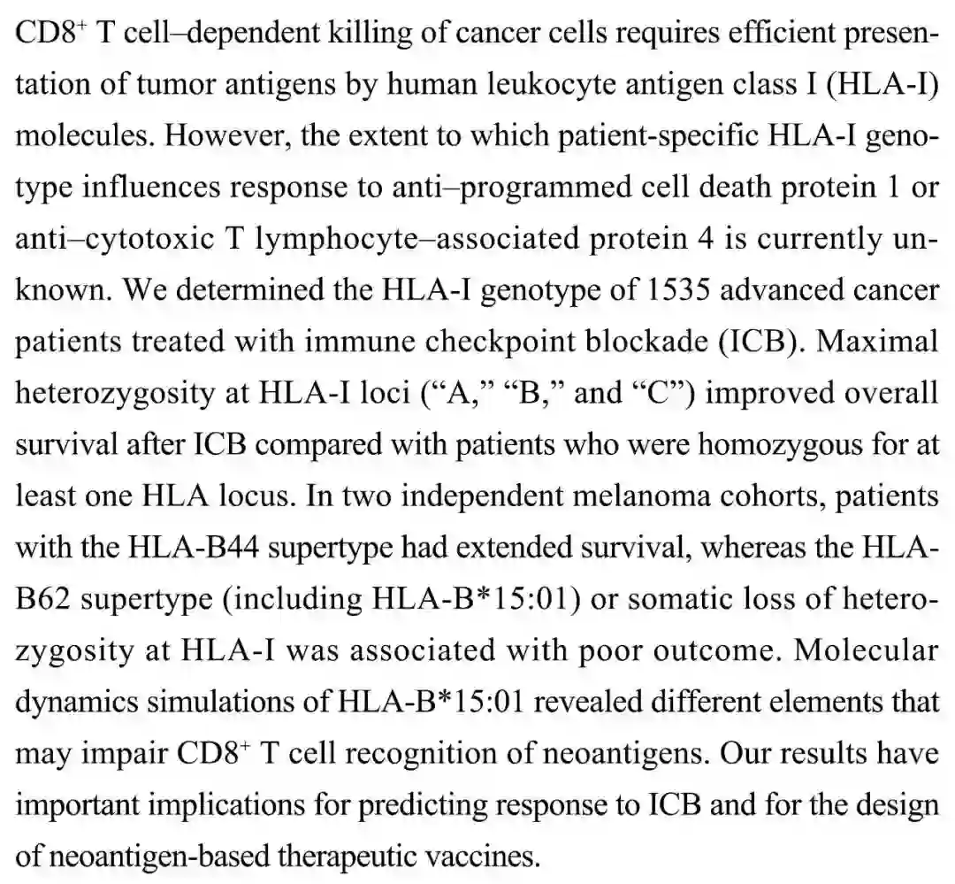 (导读 阿金)患者特异性 HLA-I 基因类型影响对抗细胞毒性 T 淋巴细胞相关蛋白的响应程度尚未清楚。本研究通过研究 1535 名接受 ICB 治疗的癌症患者,确认 HLA-I 基因座杂合性最大的患者接受治疗后的响应效果更好,且揭示了能够削弱 CD8+ T 细胞识别新抗原的不同元件,为设计新抗原阻断疫苗提供新思路。