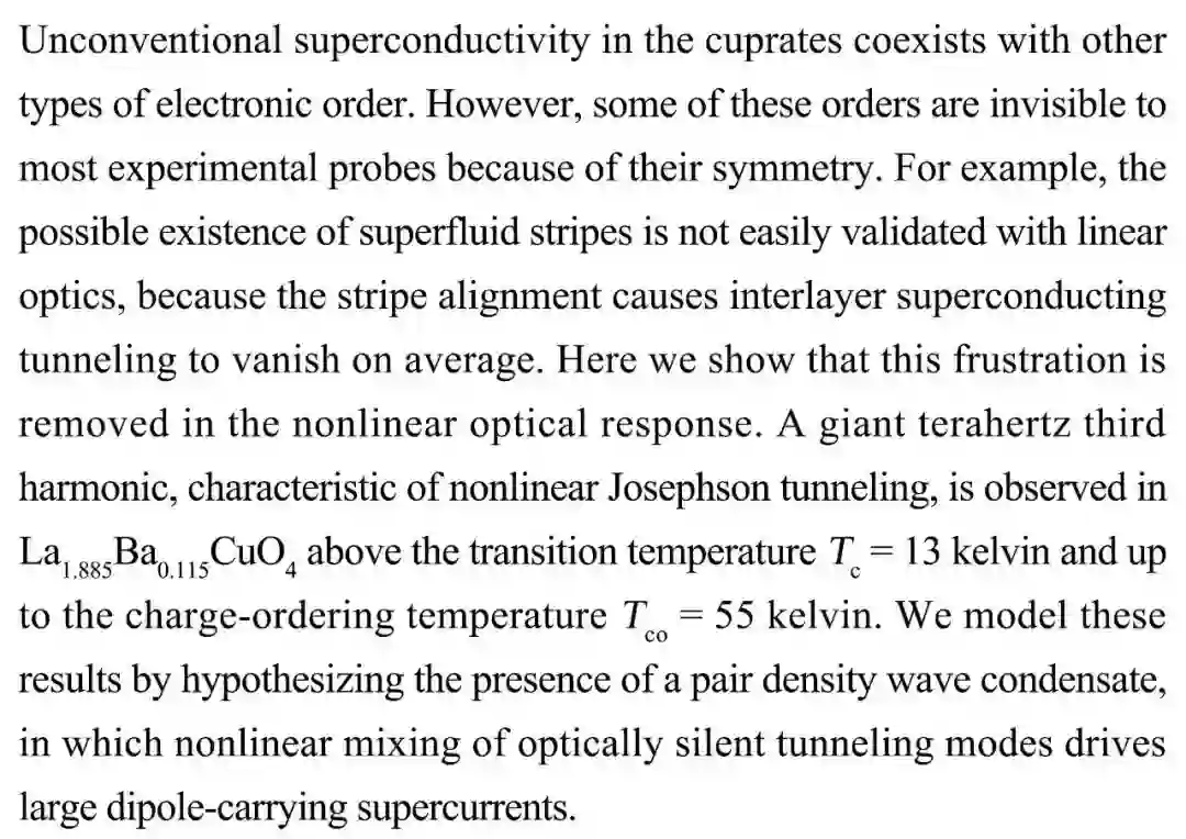 (导读 阿金)铜氧化物所具有的对称性使其中某些电子有序难以通过实验观测。本研究使用非线性光学响应分析 La1.885Ba0.115CuO4 ,在 13 开尔文的转变温度到 55 开尔文的电荷有序温度间观测到非线性约瑟夫隧道效应特征,表明光学沉默隧道模式的非线性混合驱动了偶极子携带的超导电流。