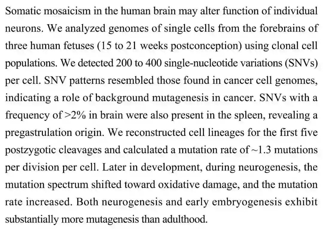 (导读 阿金)人类大脑中个体神经元之间的基因差异会导致功能差异。本研究使用克隆细胞群技术分析了三个人类胎儿(受孕 15 至 21 周)的前脑单细胞基因组,发现每个细胞内含 200 至 400 个单核苷酸位点变异,并分析了变异的分布模式、计算了突变率,结果显示高频率突变起源于原肠胚形成前期,而从神经生成期开始,突变率随氧化损伤出现而提高。
