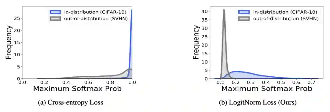 下图进一步展示了 IND 和 OOD 数据的 softmax 置信度分数分布,可以看出传统交叉熵会导致大多数 OOD 样本被分配一个较高的置信度分数,而 LogitNorm 可以更好地区分 IND 和 OOD。