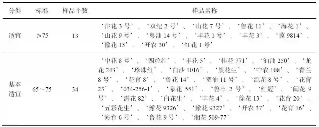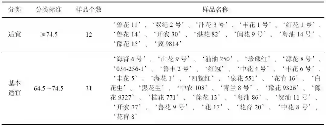 以各性状指标得分之和作为各品种资源的最终得分,将各个品种最终得分分为3 类,即Ⅰ级(适宜)、Ⅱ级(基本适宜)、Ⅲ级(不适宜),Ⅰ级、Ⅱ级品种见表8。比较分析发现适宜准确率为91.7%,基本适宜准确率为90.3%,结果较好。