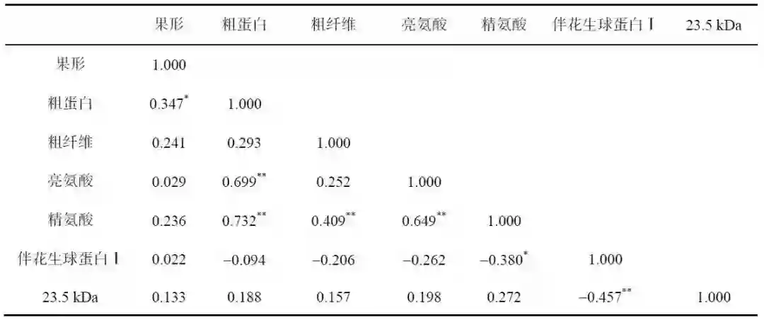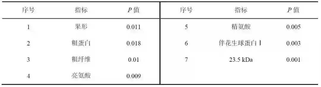 将筛选出来的7 个品质指标进行相关性分析(表2),对于在0.01 水平上显著、相关系数大于0.600 的指标,用其中一个指标表示另外一个指标,故保留的指标为果形、粗蛋白、精氨酸、伴花生球蛋白Ⅰ和23.5 kDa 蛋白质亚基。