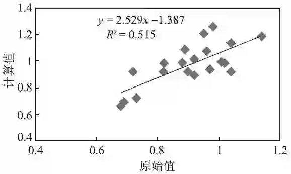 为了考察建立模型的准确性及推广适用性,采用剩余的21 个品种进行模型的验证。离群点分析发现,‘花冠王’的凝胶性为离群点,将其删除。将20 个花生品种的果形、粗蛋白精氨酸、伴花生球蛋白Ⅰ、23.5 kDa 5 个指标代入公式,计算20 个品种的凝胶性,并将模型计算结果与凝胶性综合值进行回归分析,二者的相关系数R 为0.718(图1)。