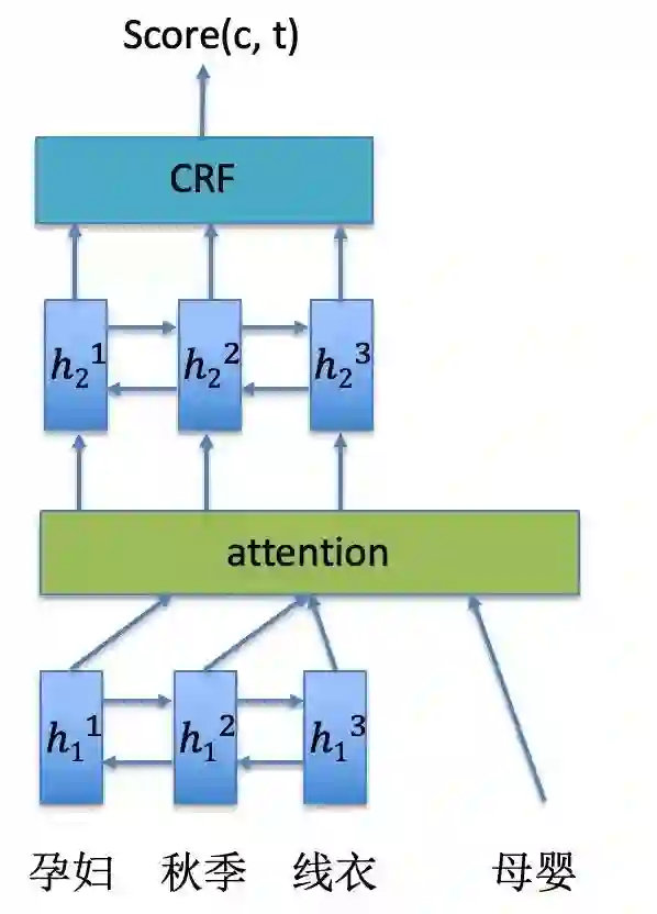 2)词义消歧: 与常规的消歧方法不同,concept通常由短文本组成,上下文能够提供的信息十分有限。因此我们选用了序列标注模型来学习词汇类型的组合,例如:“对象”+“风格”+“品类”等等。由于考虑到不同行业下,词汇的类型不同,例如,“拼接”这个词,在“服饰”领域下,“拼接针织连衣裙”中的“拼接”类型为“风格”,而在“家具灯具”领域中,“拼接水管”的类型为“功能”,因此我们使用了attention机制来学习领域相关的信息。序列标注的模型如下图所示: