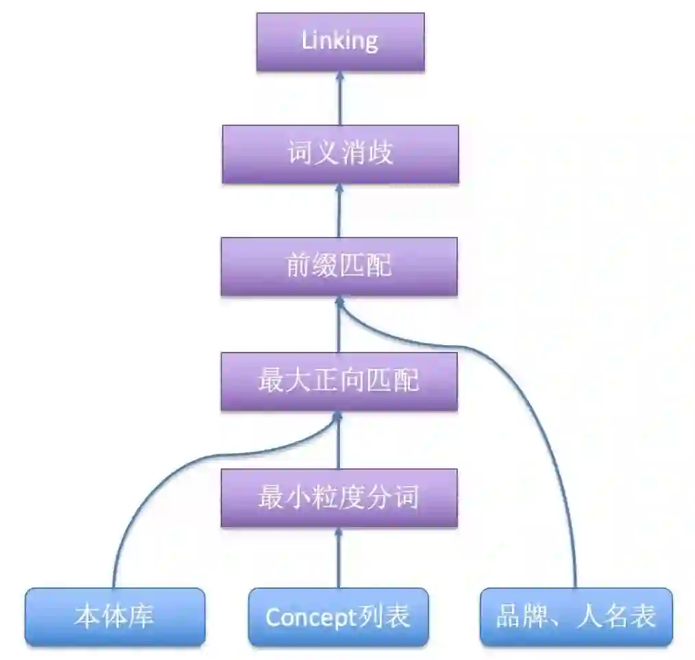 1) 基于词典的最大正向匹配及前缀匹配:给定一个concept,算法首先使用最小粒度分词,将concept切分成词,然后使用最大正向匹配算法,从左到右将分词后的concept的几个连续词与本体库的词典匹配,如果匹配上则返回本体词汇及类型(ID)。