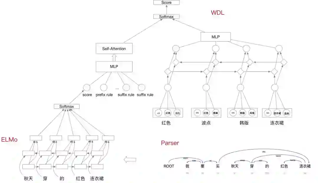 我们一方面结合一些简单的规则进行特征抽取,另一方面,利用现有的序列特征训练Wide&Deep model,来进行concept的合理性判断。在初始数据的处理方面,由于我们大部分的concept都是短文本,而query和title中大部分的term序列不符合正常的语序,我们还利用长文本的parsing infomation进行候选抽取和截断,训练了ELMo作为基础的语言模型,并在同样长度的gram内调整语序,来得到最佳的序列信息再给判别模型。