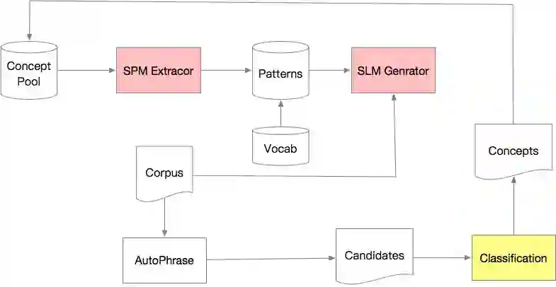 Concept Mining主要分为两步,一个是候选生成(Candidate Generation),另一个是概念正确性判断(Concept Classification)。总体流程如下:
