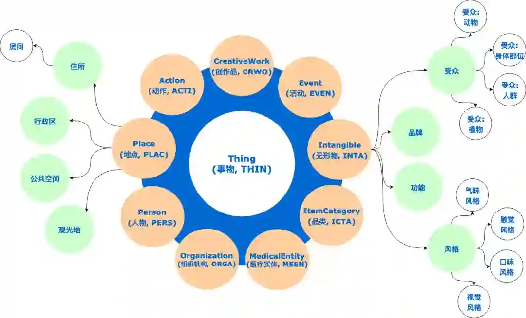 在这里,我们参考Schema.org、cnSchema.org中对客观事物进行描述的结构,建立了以事物类(Thing)为根节点的电商知识图谱底层本体分类体系。在事物类的子类中,包括“动作”、“创作品”、“活动”、“无形物”、“品类”、“医疗实体”、“机构”、“人物”、“地点”共9大类。每一个子类又有其自己的子类,每一个子类将继承父类的所有属性和关系。具体结构如下图所示:
