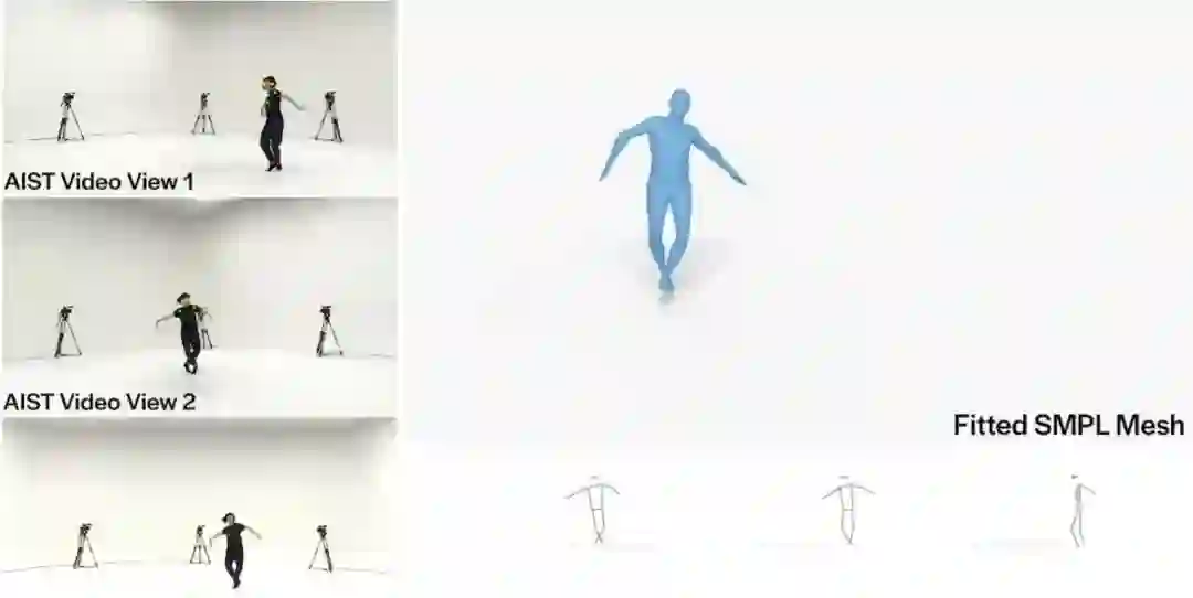 AIST++ 舞蹈动作数据集是从 AIST 舞蹈视频数据库构建的。对于多视图视频,设计了一个精心设计的管道来估计相机参数、3D 人体关键点和 3D 人体舞蹈动作序列:
