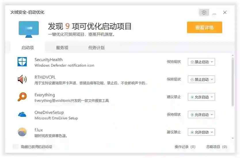 不喜欢折腾的用户可以选择第三方工具提供的优化策略,比如火绒安全的启动优化提供了一键优化功能,还可以回看操作记录、设置忽略项目。